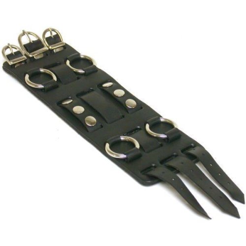 New Leather Wide Cuff Watch Band. This is a new genuine black leather wide cuff watch band. It has three rows and three buckles. The two outer rows have three studs on the middle column and a hoop at each end. This will hold a watch from 14 to 22 mm (9/16" to 7/8"). The band measures approximately 10 1/4" x 2 1/2" (260 x 64 mm).Customer Reviews